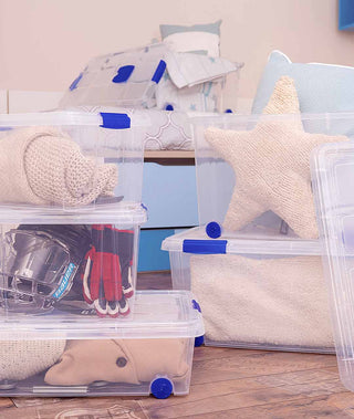 Nuestras míticas cajas de plástico de almacenaje con cierres azules. Ahora con un nuevo diseño mejorado, más robusto y resistente, ideal para guardar juguetes, sabanas, toallas o lo que veas necesario.